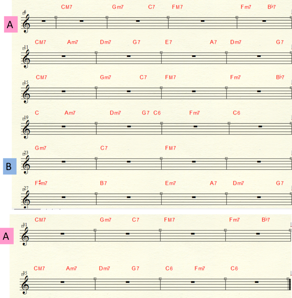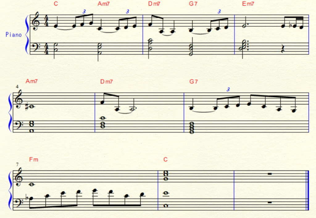ポイント:歌が聴きやすいように、和音はジャズ的なテンションを抑えめに、しかしムードを壊さずに。ペダルや音の伸ばし、コードの抑え方で “浮遊感” や “空気” を演出。イントロや間奏では、軽く “テーマの要素” を入れて雰囲気をセット。