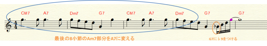 CM7とA7でG音のペダルポイントを利用してより雰囲気がアップします。