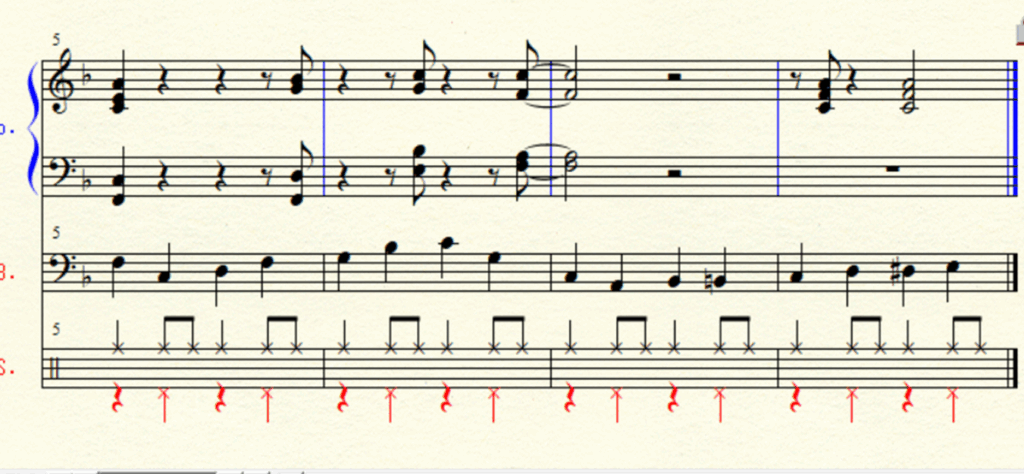 ベースは1拍目と3拍目を中心に「ドン・ドン」と弾くため、リズムが軽く、少し跳ねるような印象になります。