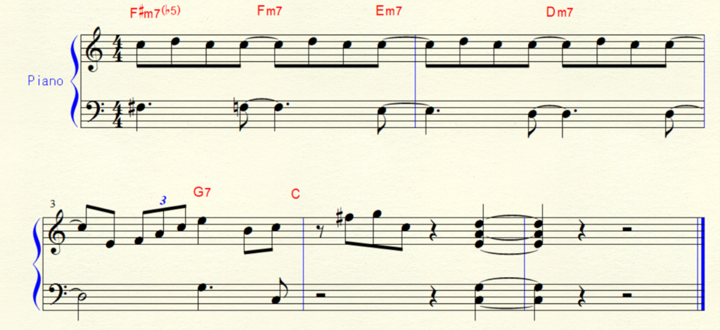 Cキーの場合 F♯m7(♭5) → Fm7 → Dm7 → Dm7 → G7 → C